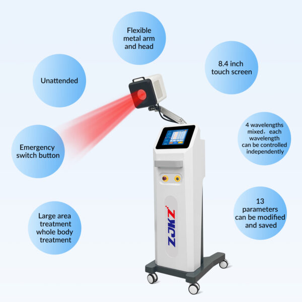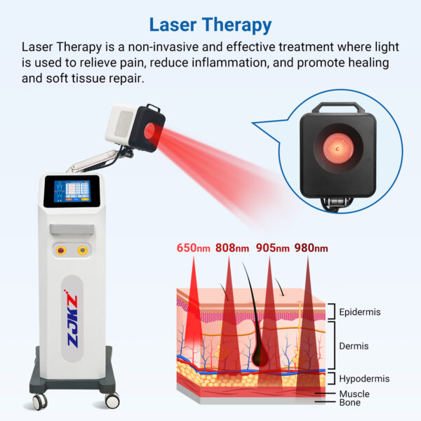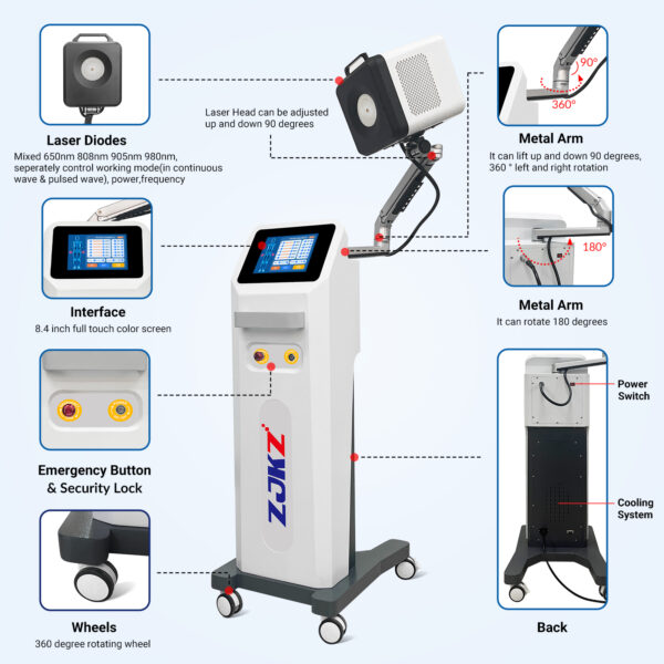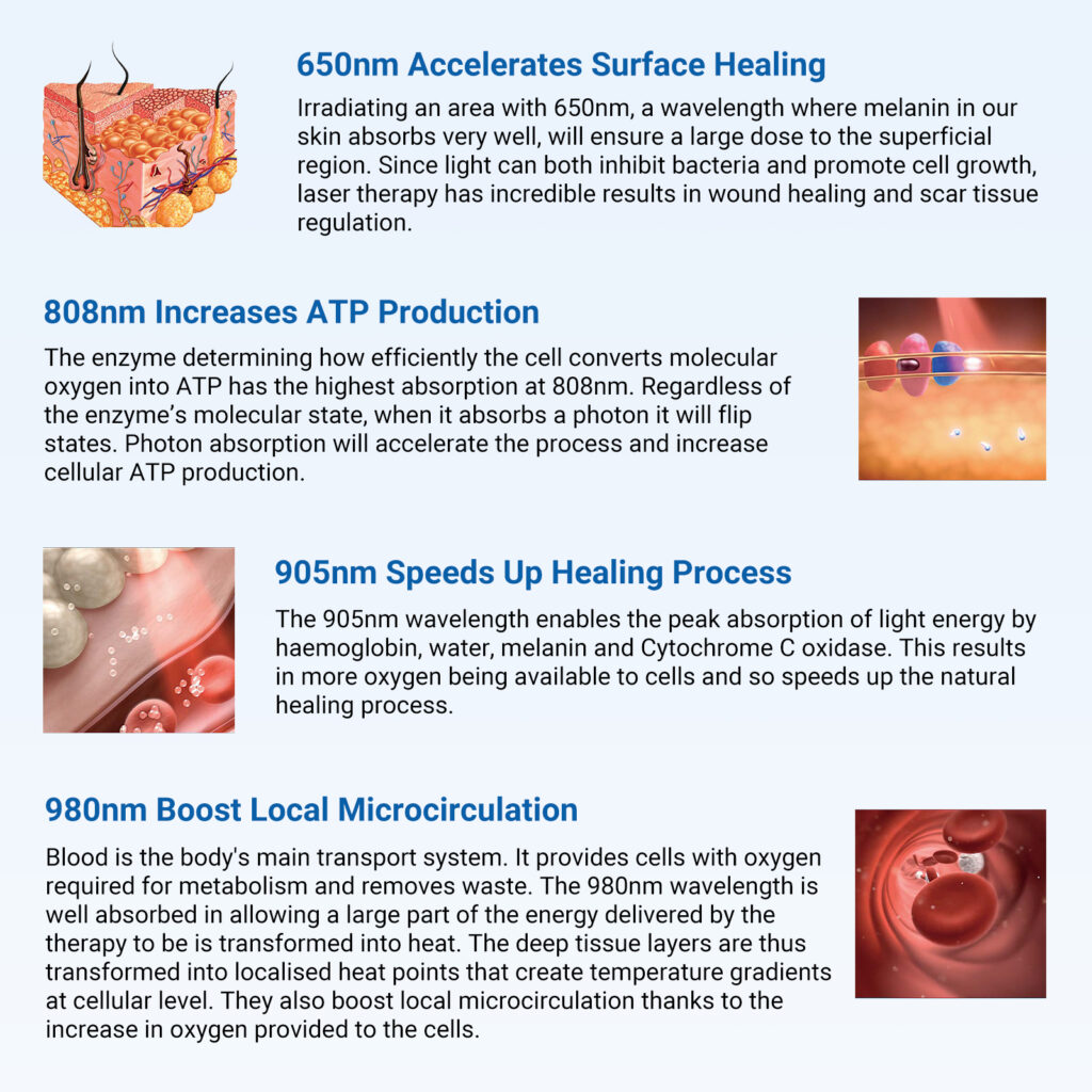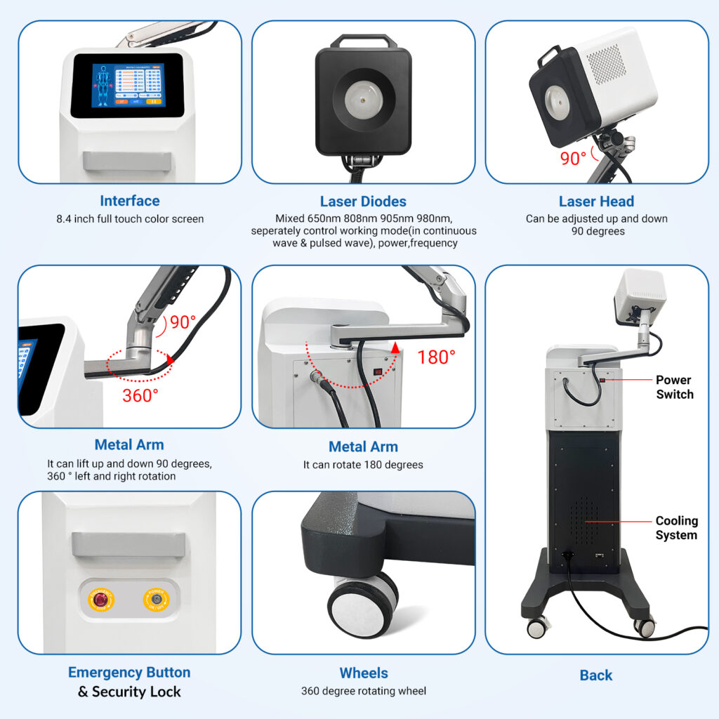 The combination of 650nm, 808nm, 905nm, and 980nm wavelengths provides comprehensive coverage from superficial tissue to deep structures. Each wavelength can operate independently or synergistically, expanding clinical applications and improving therapeutic outcomes.