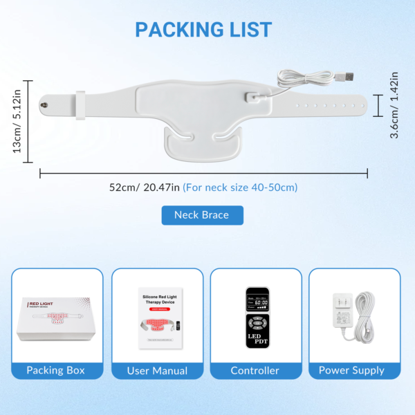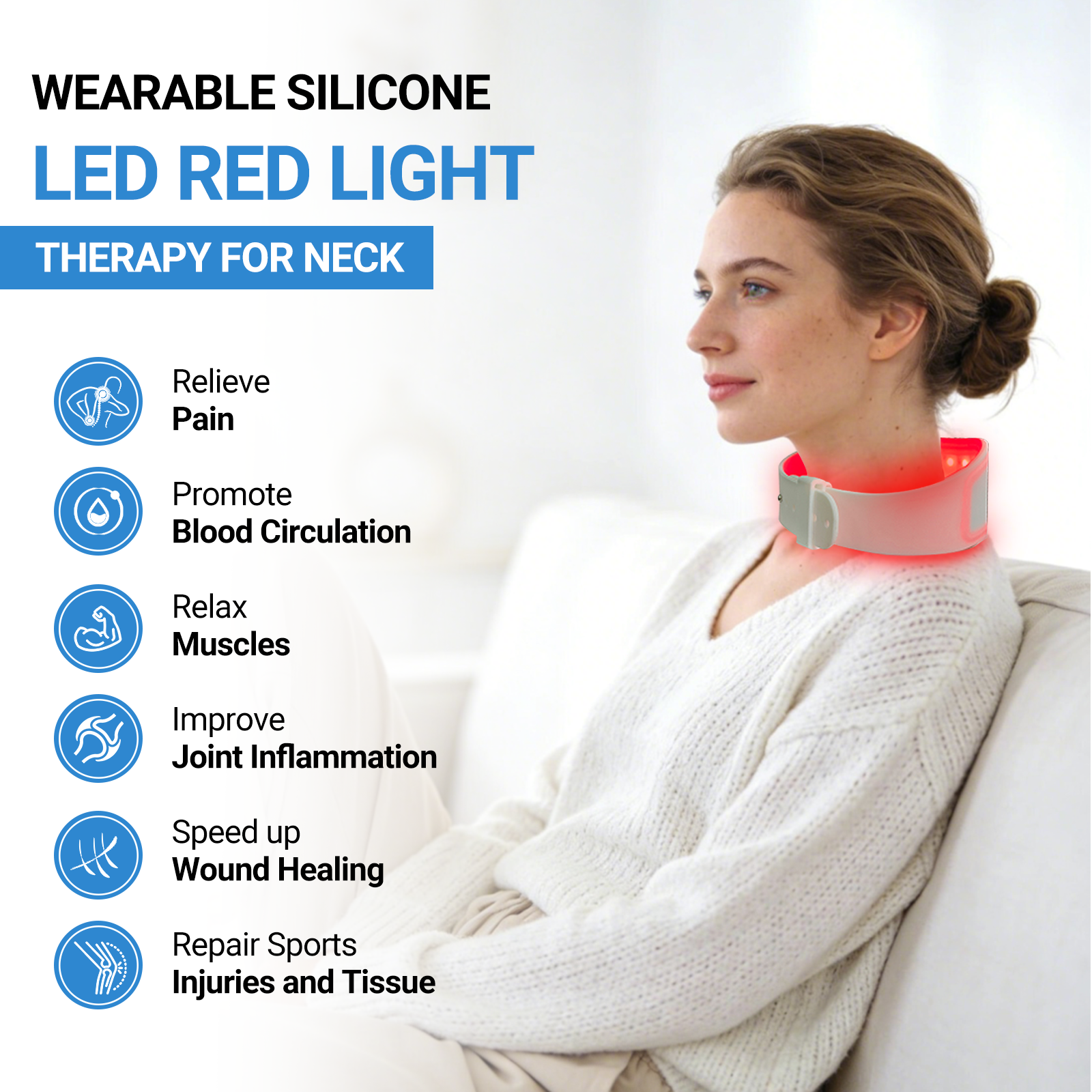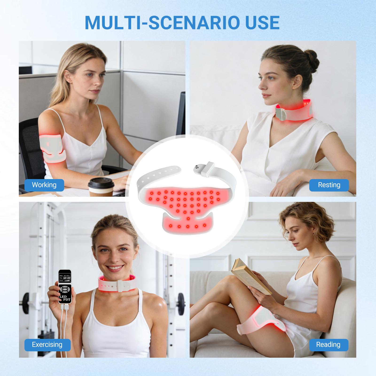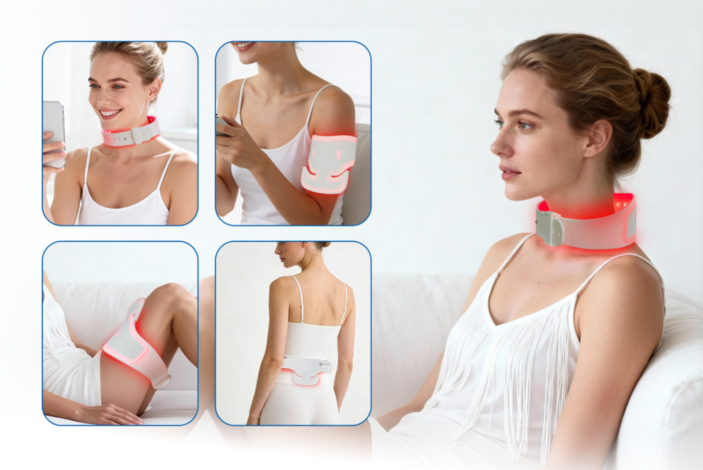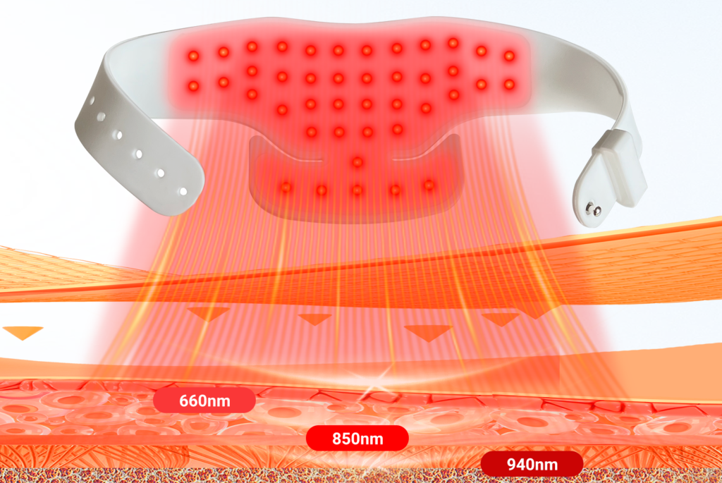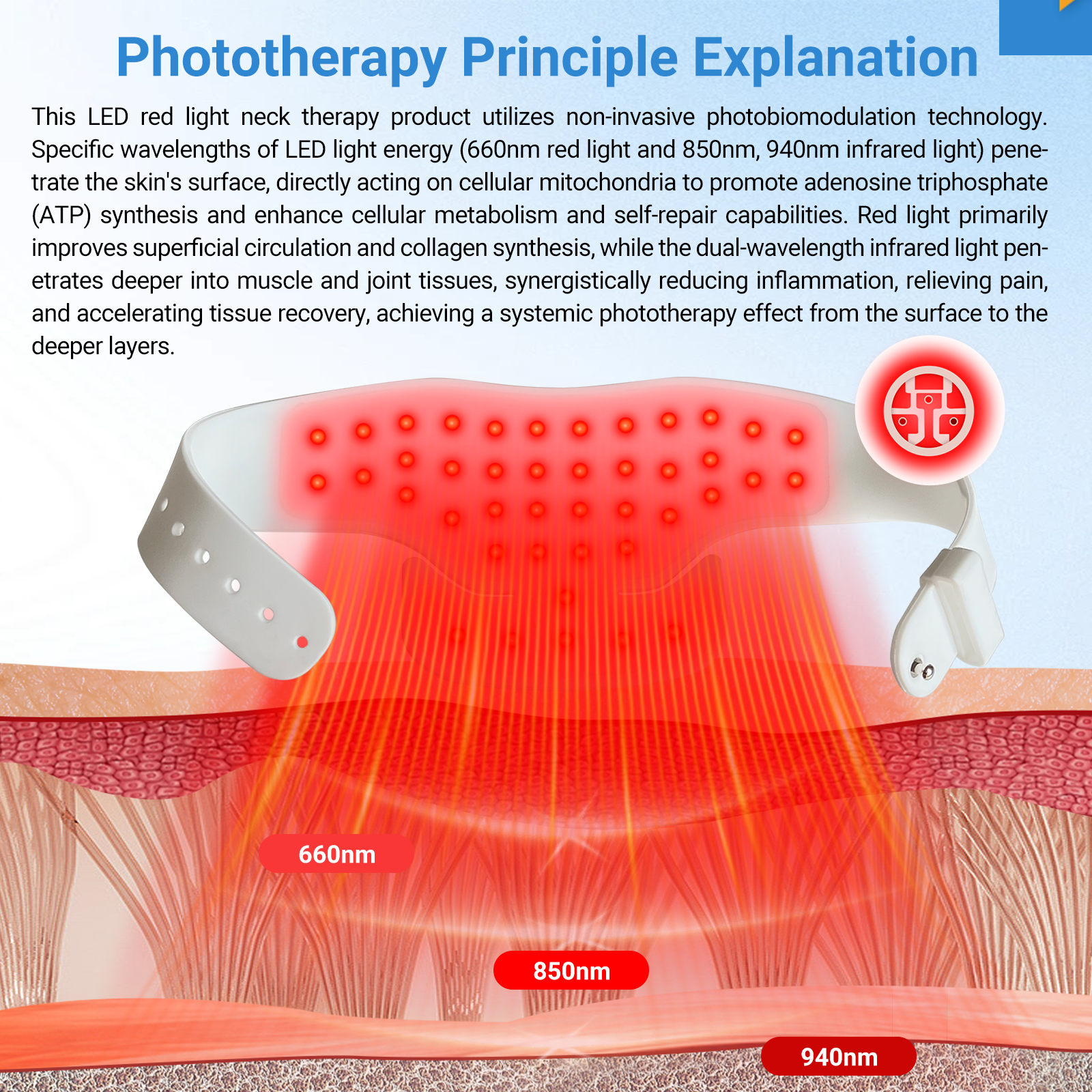 This LED red light neck therapy product utilizes non-invasive photobiomodulation technology. Specific wavelengths of LED light energy (660nm red light and 850nm, 940nm infrared light) penetrate the skin’s surface, directly acting on cellular mitochondria to promote adenosine triphosphate (ATP) synthesis and enhance cellular metabolism and self-repair capabilities. Red light primarily improves superficial circulation and collagen synthesis, while the dual-wavelength infrared light penetrates deeper into muscle and joint tissues, synergistically reducing inflammation, relieving pain, and accelerating tissue recovery, achieving a systemic phototherapy effect from the surface to the deeper layers.