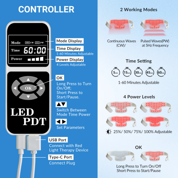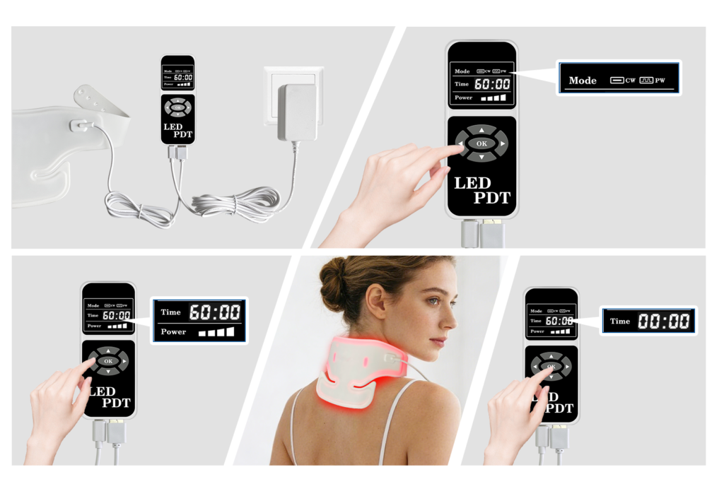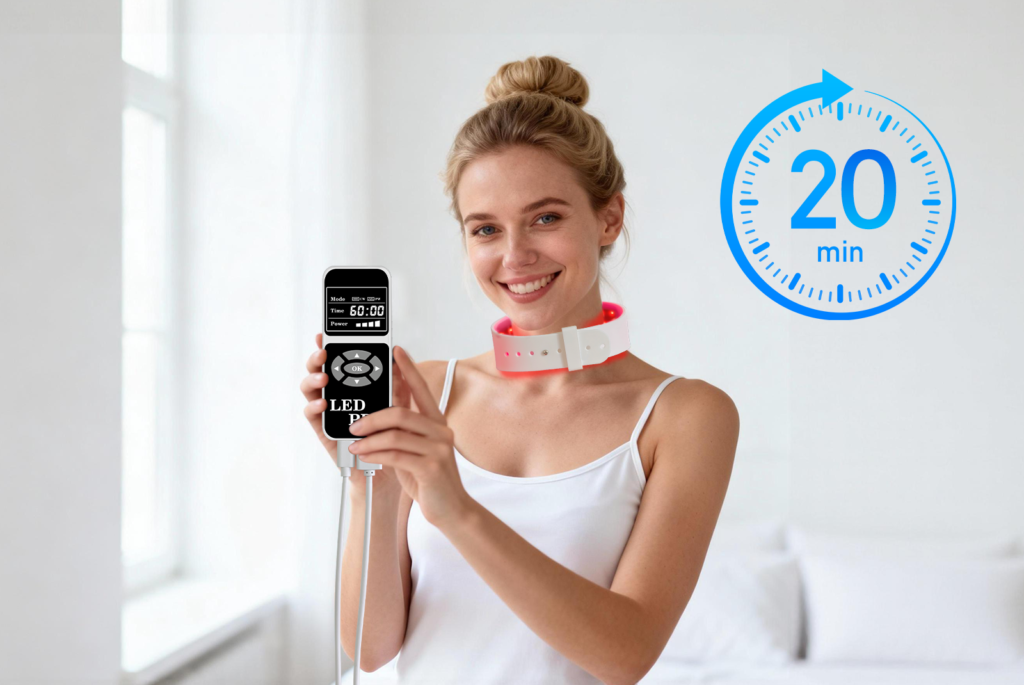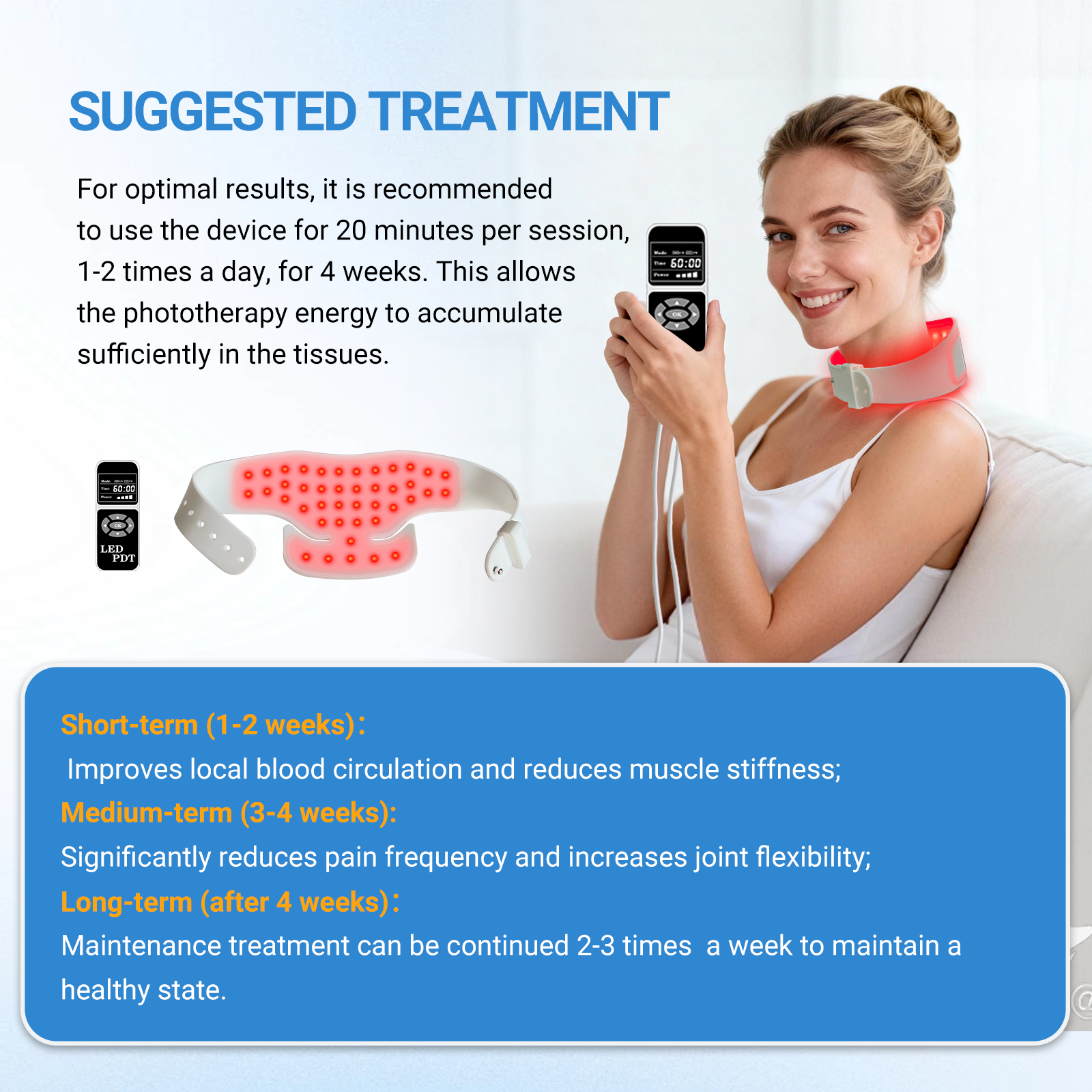 For best results, it is recommended to perform the treatment for 20 minutes per session, 1-2 times a day, for 4 weeks. This allows the phototherapy energy to accumulate sufficiently in the tissues.
