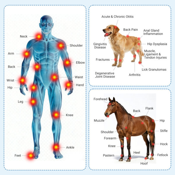 This therapy device is suitable for both human and animal care: For humans: It addresses conditions like arthritis, sports injuries, soft tissue damage, nerve pain, herniated discs, carpal tunnel syndrome, and fibromyalgia, relieving inflammation, swelling, and chronic pain. For pets (dogs, horses, etc.): It treats issues including gingivitis, intervertebral disc problems, musculoskeletal abnormalities, soft tissue trauma, and ear infections, supporting their comfort and recovery.