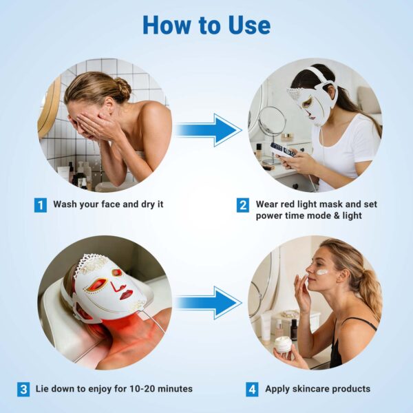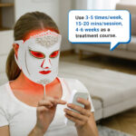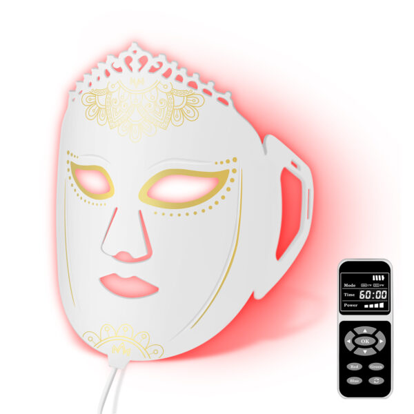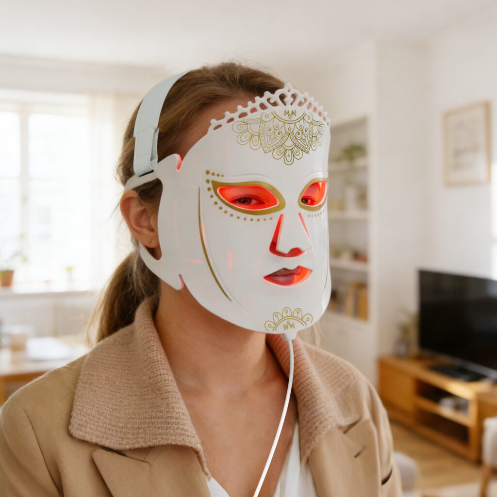 LED facial masks use light therapy in specific wavelengths (colours!) using LED’s (LIGHT EMITTING DIODES) to increase facial blood circulation and stimulate a.o. collagen production and acne reduction.