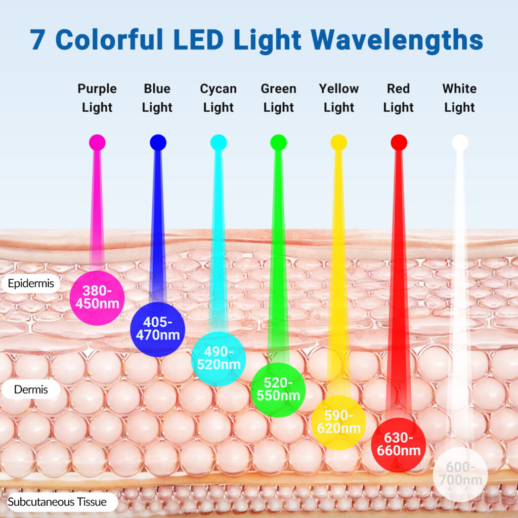 7 Colors | Red / Green / Blue / Yellow / Purple / Cyan / White Light Therapy, Adjustable |