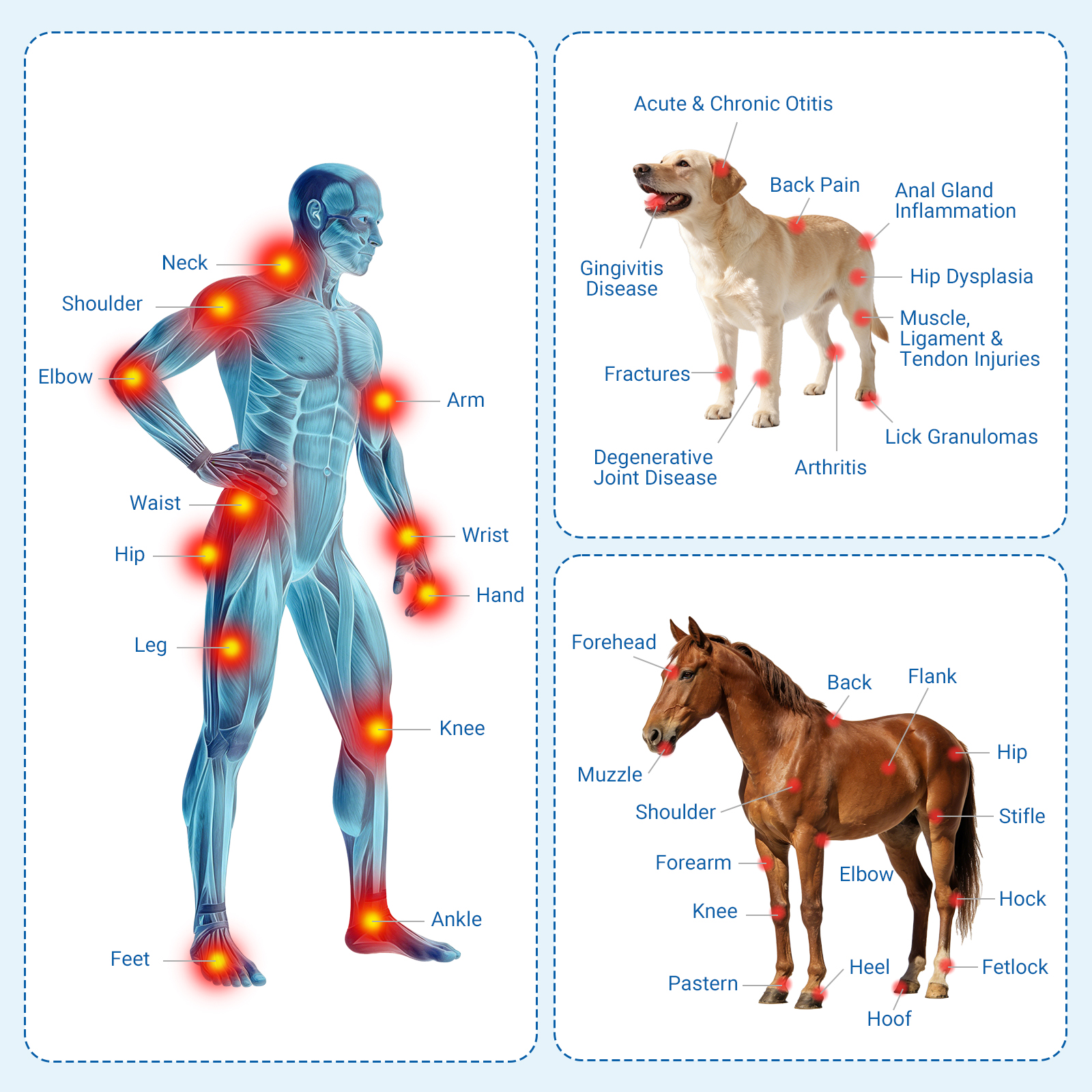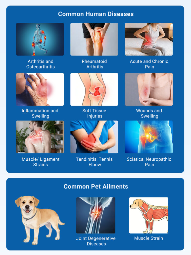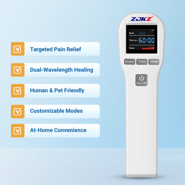 During use, the device emits continuous/pulsed light (adjustable frequency) to deliver controlled energy. The body absorbs this light, activating natural healing processes without surgery, medication, or recovery time — making it safe for home use on both humans and pets.