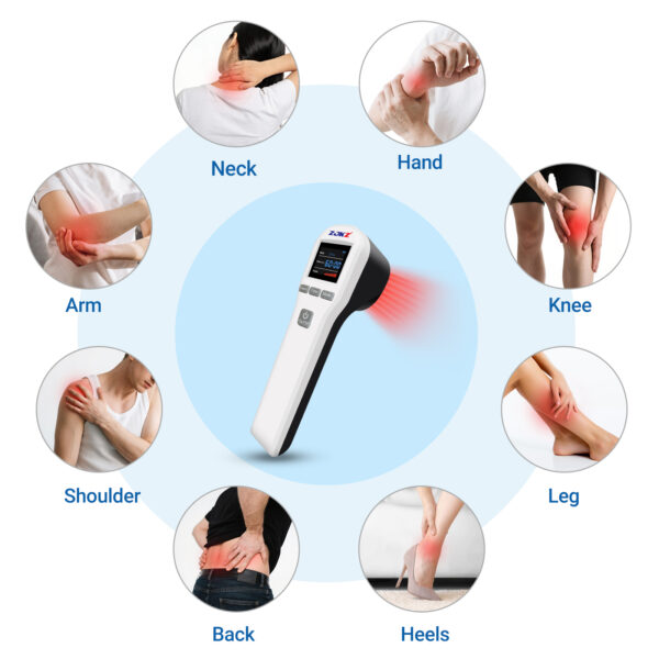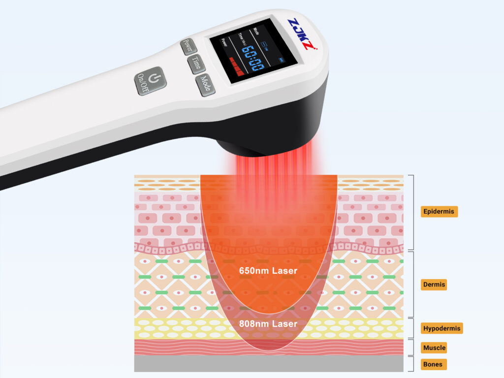 The dual-wavelength combination is designed to complement each other and cover different treatment needs. The 650nm visible red light has a tissue penetration depth of 0.5-2cm, which is very suitable for relieving superficial pain, promoting the healing of superficial wounds, skin ulcers and post-operative incisions, and significantly accelerating epithelial cell regeneration. The 808nm near-infrared light has a deeper penetration depth of 3-5cm, which can directly act on deep tissues such as muscles, tendons and joints, and is more effective in relieving deep pain caused by muscle strains, arthritis, tendinitis and other problems. Compared with single-wavelength devices, this dual-wavelength design can realize full-layer tissue treatment, covering both superficial and deep pain relief needs, and improving the overall therapeutic effect.
