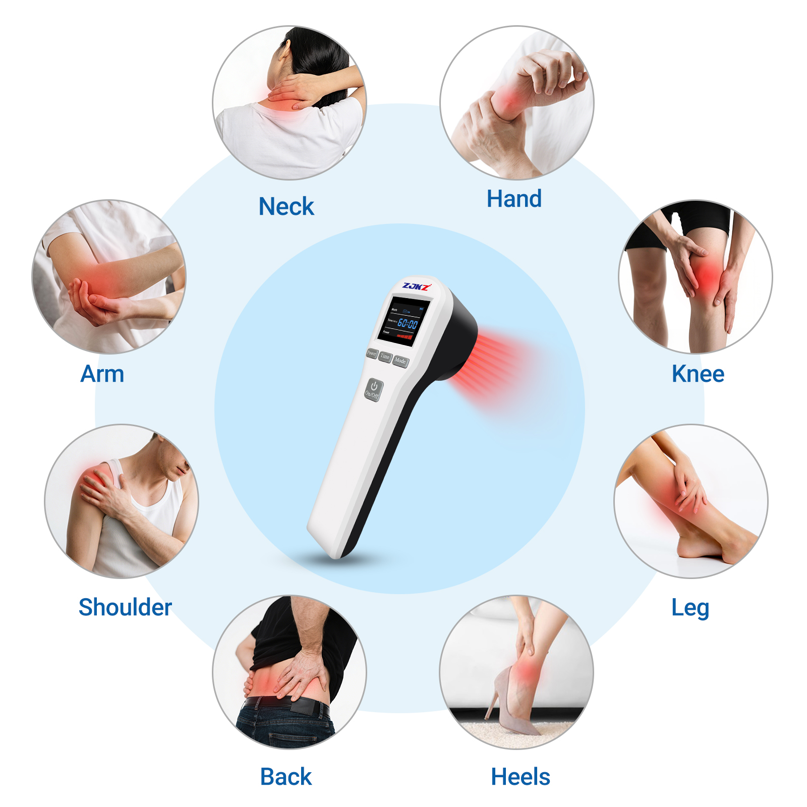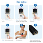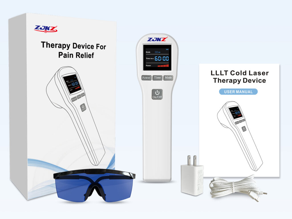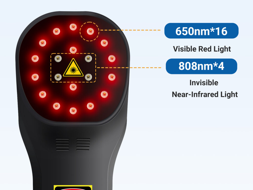 This device adopts Low Level Laser Therapy (LLLT), also known as photobiomodulation therapy (PBM). Its 20 diodes emit 650nm visible red light and 808nm near-infrared light, which can be absorbed by cytochrome c oxidase in cell mitochondria when penetrating the skin tissue. This absorption promotes the production of adenosine triphosphate (ATP) (the main energy source for cell repair), improves local blood circulation, reduces inflammatory factors, regulates nerve signal transmission, and stimulates the release of endorphins, thereby achieving non-invasive pain relief, anti-inflammation and tissue repair effects without thermal damage to the skin (it is also called “cold laser” therapy).