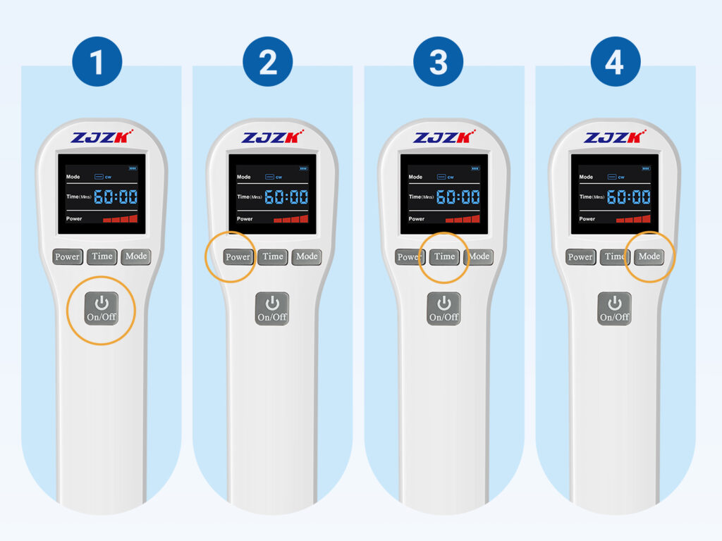 4. Mode: Quick click Mode button it switch at CW-continuous wave and PW-pulsed wave.