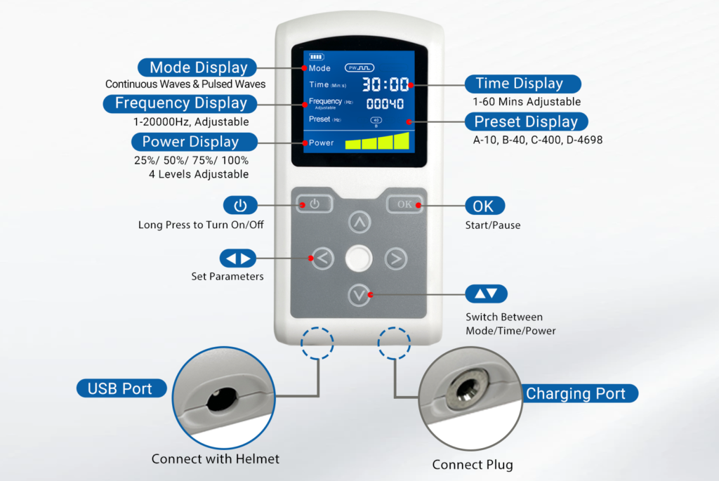 The multifunctional controller is easy to operate. Users can select between continuous wave (CW) or pulsed wave (PW) modes, and the power can be adjusted in four levels: 25%, 50%, 75%, and 100%. The treatment time can be flexibly set from 1 to 60 minutes. The controller has four preset common frequencies (10Hz, 40Hz, 400Hz, and 4698Hz) for quick selection, and also supports custom frequencies within the range of 1 to 20000Hz to meet diverse treatment needs. When using the 810nm/1070nm brain phototherapy helmet for photobiomodulation therapy, the required pulse frequency and treatment duration can be adjusted accordingly for different brain diseases.