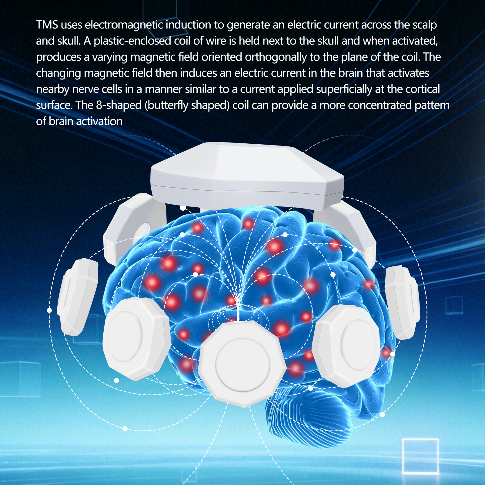 TMS uses electromagnetic induction to generate a changing magnetic field, which penetrates the skull non-invasively and induces current in specific brain regions to modulate neuronal activity, achieving targeted treatment of neurological and mental disorders.